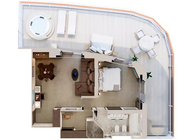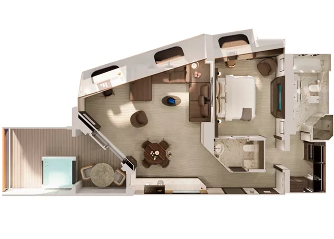 | Retreat Residence Suita 63 m² + Terasa s vírivkou a sedením 14 m² / 7. paluba: 18 m². Spálňa s obývacou a jedálenskou časťou, šatník. Koktailová súprava, minibar, kávovar, vodná kanvica, ďalekohľad, sejf, mramorová kúpeľňa s vaňou a sprchou, extra wc. Taška Technogym Case Kit. Fľaša šampanského na privítanie. Služby osobného majordóma. Maximálna kapacita 3 dospelí alebo 2 dospelí + 2 deti pod 18 rokov. | 49 612 € 12 403 € za osobu | ||