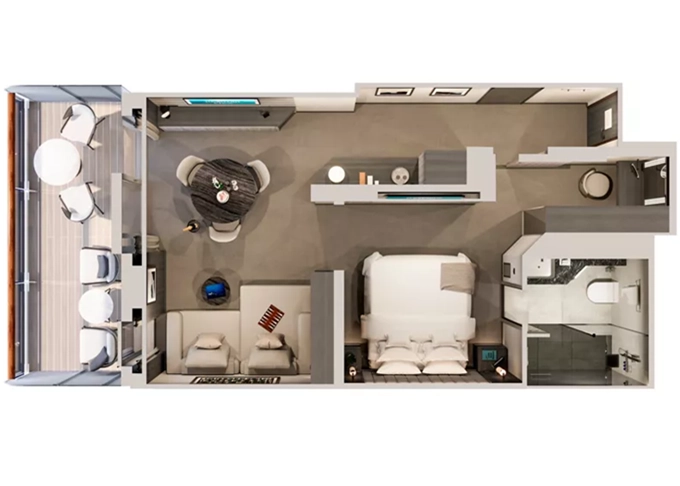 | Ocean Residence - Cove Residence Suita + terasa so sedením a lehátkami 56 m². Spálňa s obývacou a jedálenskou časťou, šatník. Koktailová súprava, minibar, kávovar, vodná kanvica, ďalekohľad, sejf, kúpeľňa so sprchou. Závesy, svetlo, klimatizácia ovládané smart technológiou. Taška Technogym Case Kit. Fľaša šampanského na privítanie. Maximálna kapacita 3 osoby. | 29 901 € 9 967 € za osobu | ||